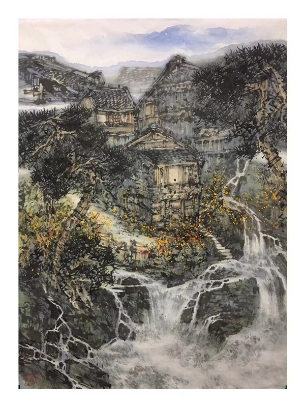 李元?jiǎng)椎漠嬑掖蠖鄶?shù)都很欣賞。我感到他畫得很縱恣,筆墨上放得很開,無論是山水系列,還是屋語系列,畫面上水和墨的洇滲效果,非常自然,給人感覺是天然的一樣,你可想到他作畫時(shí)候,毛筆散鋒都已經(jīng)散到那種程度了,他也不可以去調(diào)整,可以說已達(dá)到了中國畫中用筆自如的境界了。