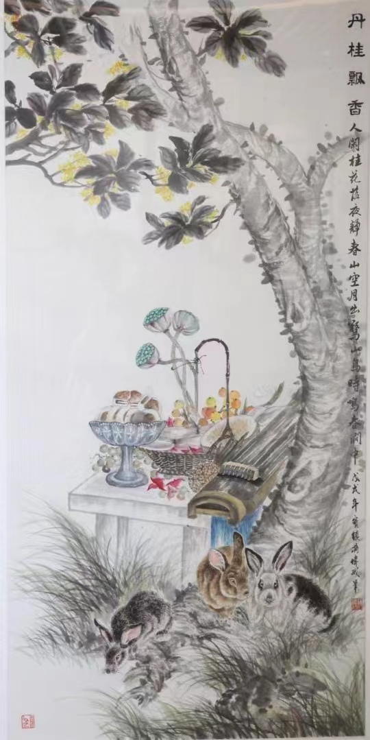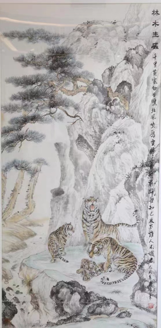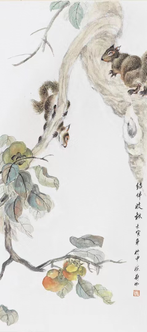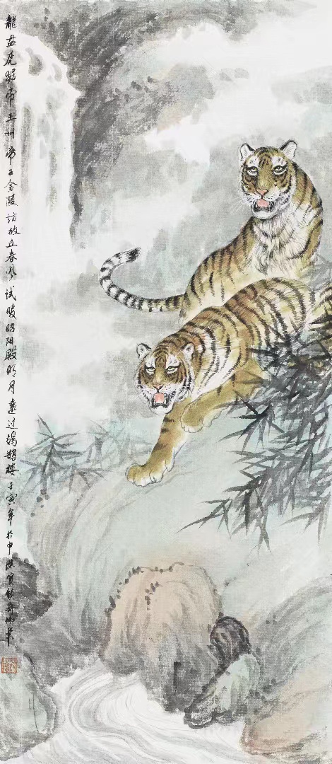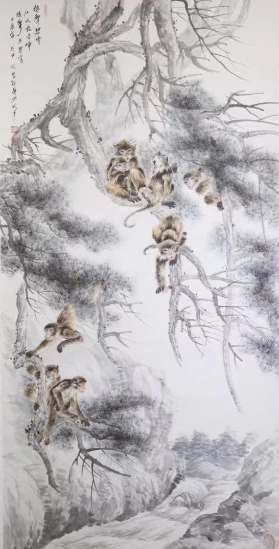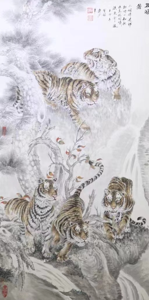 我注意到,蔣偉的十二生肖長(zhǎng)中,每種動(dòng)物背后都配有豐富的對(duì)應(yīng)背景。畫(huà)什么動(dòng)物要搭配什么背景,這在中國(guó)傳統(tǒng)繪畫(huà)中是有嚴(yán)格講究的,不能亂搭配,比如猛虎往往出沒(méi)于山林,這就不但要求畫(huà)家會(huì)畫(huà)虎,還必須有一定的山水畫(huà)基礎(chǔ)。動(dòng)物是人類(lèi)的朋友,亦是科學(xué)藝術(shù)的靈感源來(lái)。中國(guó)文化深受中國(guó)古典哲學(xué)的影響,古人把十二生肖分為六組,兩兩相對(duì),集中起來(lái)歸于一點(diǎn),就是每一對(duì)組合都是相互依賴(lài)、相互補(bǔ)充、相互滲透、相互完善的,用儒家思想解釋?zhuān)褪恰熬雍投煌保@也正是儒家所倡導(dǎo)的人與人的相處之道。中國(guó)古代哲學(xué)很早就孕育出了“一張一馳”“對(duì)立統(tǒng)一”“陰陽(yáng)互補(bǔ)”的辯證法思想,這也是我們中國(guó)文化之所以能夠源遠(yuǎn)流長(zhǎng)幾千年的緣故。將偉在他的畫(huà)中,將動(dòng)物與山水、花鳥(niǎo)、草木集中展現(xiàn)在一起,并還原了動(dòng)物與自然的關(guān)系,讓人感到生命與自然的可愛(ài)和寶貴。他用畫(huà)筆構(gòu)建了一個(gè)和諧世界,世外桃源,從而表達(dá)出他對(duì)生態(tài)平衡意識(shí)的思考,強(qiáng)調(diào)了各類(lèi)生命之間相互扶持的重要性,顯示出辯證看待問(wèn)題的思維模式,這是很不容易的。一幅十二生肖長(zhǎng)卷對(duì)畫(huà)家繪畫(huà)功底的全面性和面外綜合文化修養(yǎng)提出了很高的要求和挑戰(zhàn)。