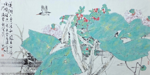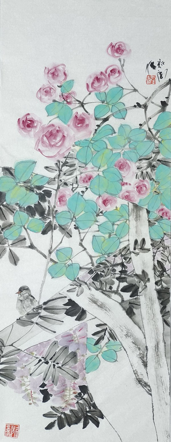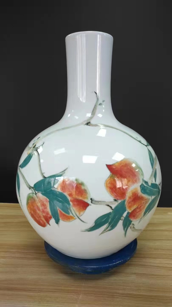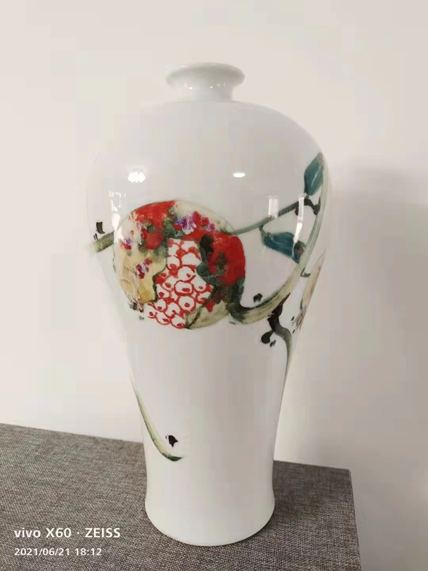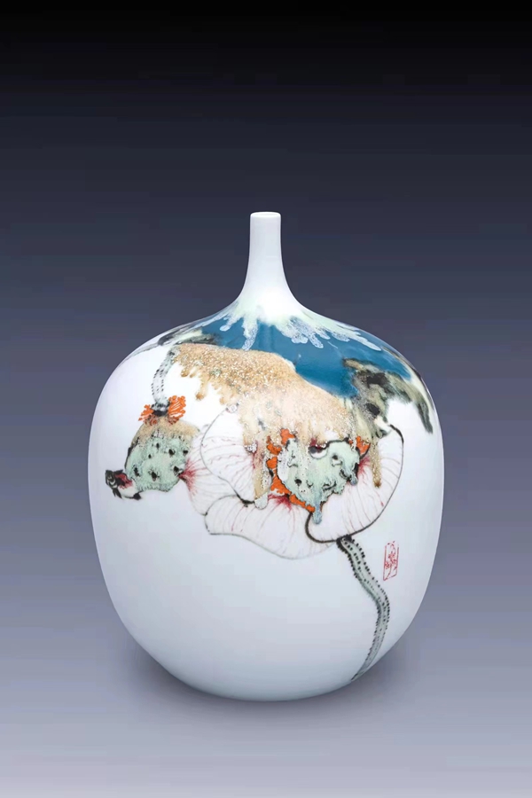 李新衛(wèi)是中國美協(xié)會員,自幼喜歡美術(shù),有著很高的藝術(shù)天賦,他的書法和國畫得到名家劉小睛和陳琪的指點。他長期從事花鳥畫創(chuàng)作,他筆下的花鳥,生機勃勃但又不事喧嘩,設(shè)色淡雅明麗,有著一種“無意苦爭春”,只是以自己芳華點綴我們生活的世界的低調(diào)和樸實,很像畫家本人性格,低調(diào)沉穩(wěn),不求聞達(dá)。李新衛(wèi)作為美協(xié)和書協(xié)的雙料會員,堅持白天上班,晚上看書寫字作畫,這些年,他埋頭秦古窯,執(zhí)著于專研瓷畫藝術(shù),專心致志地在瓷坯上揮毫作畫,在烈焰與瓷土1300度高溫的對話中,讓自己的藝術(shù)開出既有中國筆墨畫韻味又有陶瓷畫飛揚神采的鮮花和小鳥。中國陶瓷素來有著“白如玉,明如鏡,薄如紙,聲如磬”的典雅氣質(zhì),新衛(wèi)畫瓷懷著對陶瓷的一片赤誠之心,反復(fù)琢磨紙上畫和瓷上畫的分野和不同。如果說,紙上畫是藝術(shù),那么瓷上畫就是藝術(shù)和技術(shù)的結(jié)合。光有紙上畫的藝術(shù)功力而不顧瓷器燒制的技術(shù)要求,就無法展現(xiàn)瓷畫的妖嬈美麗。特別是釉彩在熊熊烈焰催生的窯變時,你對火候的掌握,對釉彩融化后流動的邊際預(yù)期控制,對色彩可能的全新的變化,新衛(wèi)都反復(fù)實驗、實踐,以求出爐的瞬間達(dá)到最光彩照人過目不忘的視覺效果。釉里紅的鮮艷,青花的素雅,綠葉的蒼翠,大都在還原繪畫色彩的同時還煥發(fā)出釉彩的特殊美感。新衛(wèi)還遵循瓷畫的規(guī)律特征,凸顯中國畫的筆墨線條千變?nèi)f化的節(jié)奏韻律,從而超越了一般的技術(shù)層面,而有了相當(dāng)?shù)乃囆g(shù)含量。同時,因為立體的瓷器不同于平面的宣紙,在構(gòu)圖上,他隨形就器,根據(jù)器形造型的不同,或扁或長,或方或圓,或大或小,慘淡經(jīng)營畫面,從而使器物上的圖像與器物渾然一體,猶如雕塑,可以從各個立面加以欣賞,各有興味。