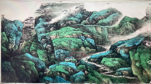 樂老師的此幅是大青綠山水,圖片上可見的水墨勾、皴、擦、點是我所補畫的。(上圖)
