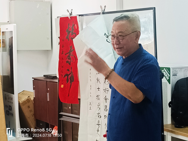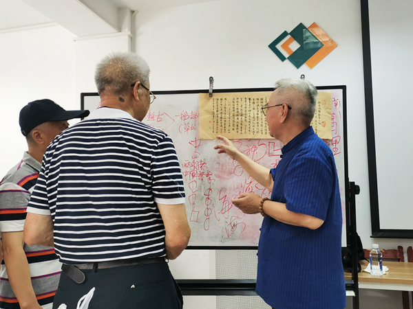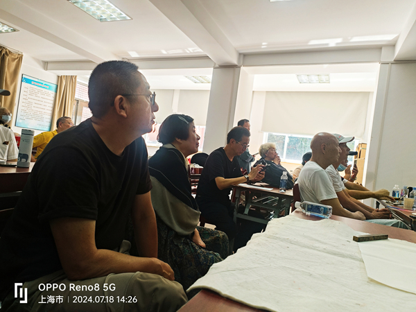 昨天,上海的三伏天,太陽火辣辣的烤著大地,整個城市熱的使人喘不過氣來,盛夏的陽光真像蘸了辣椒水,坦蕩蕩的街上沒有一塊陰涼地,天氣悶熱得要命,一絲風(fēng)也沒有,但是,上海知青書畫聯(lián)誼會的會員們,卻冒著酷暑,滿懷激情的從城市的各個區(qū),來到聯(lián)誼會的活動基地,長寧區(qū)天山社區(qū)文化活動中心教學(xué)樓,因?yàn)榻裉焓侵麜遥?lián)誼會常務(wù)理事王宜明老師來到現(xiàn)場,在教學(xué)樓做現(xiàn)場講座,這次活動吸引了聯(lián)誼會不同畫種的藝術(shù)家和藝術(shù)愛好者,這里有版畫、國畫、水彩畫、油畫和還有書法專業(yè)的,那么多畫種的藝術(shù)家和藝術(shù)愛好者,都是奔著王宜明老師而來,來聽講座,下午一點(diǎn)半的講座還沒有開始,教室里已經(jīng)來了許多人了。