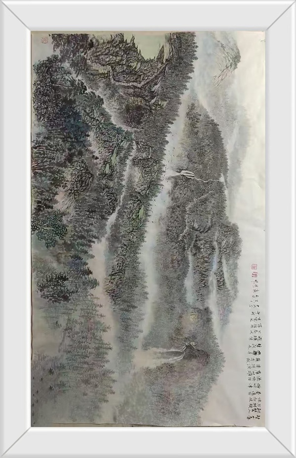 構圖如造園,需深諳「開合之道」與「虛實之妙」。經典的「品字形三疊法」恰似搭建水墨舞臺的黃金框架,通過山石的錯落形成「開」的空間張力,又以云霧、溪流實現「合」的氣韻貫通。留白之處暗藏玄機——蜿蜒的水流似S形舞動,峭壁的走勢若Z形延伸,這些無形的韻律構成畫面的呼吸節奏。更需領悟矛盾統一的哲學智慧:近景的重墨與遠景的淡彩形成視覺對話,密集的苔點與大面積留白達成疏密平衡,讓二維宣紙承載三維的空間詩意。