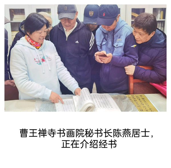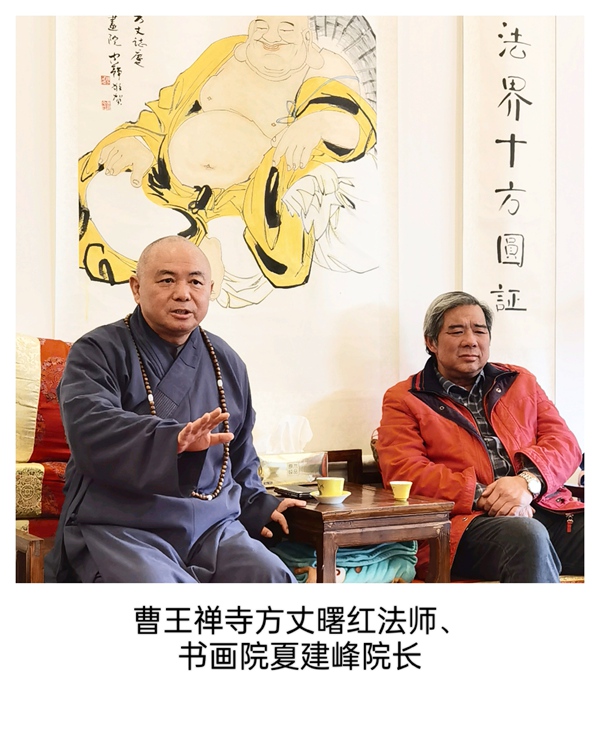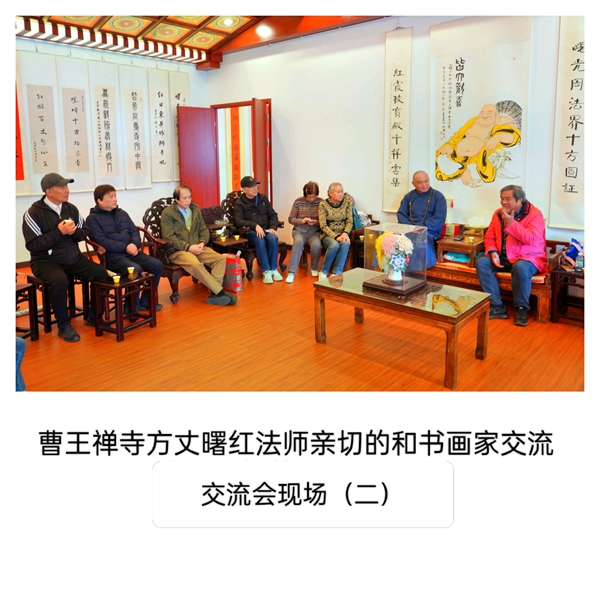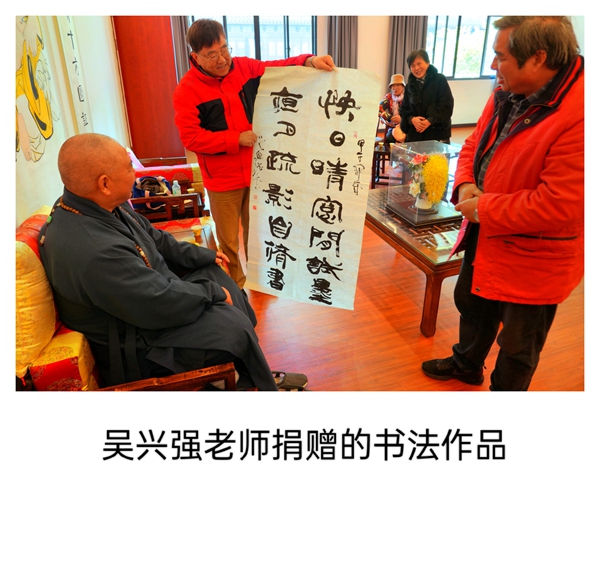 活動首站,眾人拜見了正在習書的曹王禪寺方丈曙紅法師。法師謙和地請大家先至客堂用茶,稍后即至。片刻之后,法師如約前來,與書畫院同仁暢敘交流。曙紅法師學識廣博、談吐從容,從佛法到藝術,由歷史至人生,無不娓娓道來。令人感佩的是,法師不僅深諳書法、精研筆墨,更將整座寺院治理得井然有序,于一殿一閣、一草一木間,皆可見其修為與匠心。