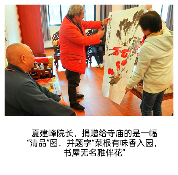 在隨后的交流環節中,夏建峰院長首先展示了準備捐贈給寺院的一幅四尺整張作品。其后,書畫院的藝術家們也紛紛呈現各自精心創作的代表之作。山水氣象萬千,花鳥生意盎然,人物形神兼備,書法筆走龍蛇——諸多佳作在古寺雅室中漸次展開,頓使滿堂增色。眾人圍繞作品切磋交流、互相啟發,藝術靈感在對話中不斷激蕩,現場洋溢著對傳統書畫藝術的誠摯熱愛與執著追求。