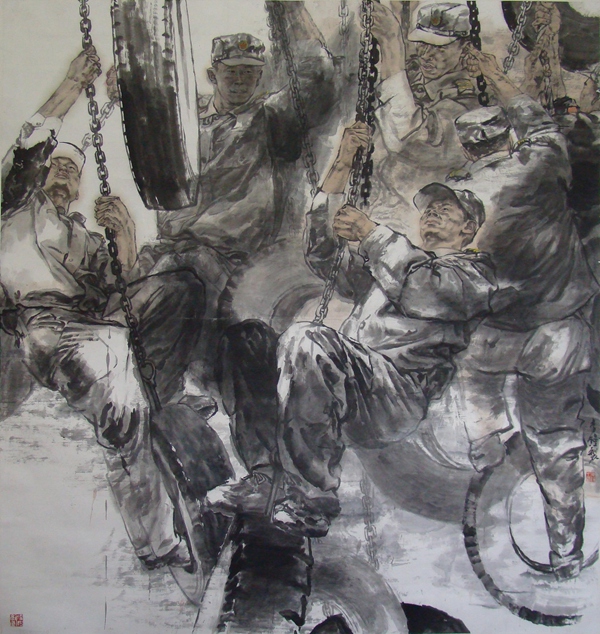 軍人的歷練當然也對李鐘作品的風格產生了影響。他喜歡下筆直取,畫面上沒有多少的機巧精術,用純粹的筆墨去直面軍營生活,透露出軍人的直爽剛正之氣。仿佛是受到了浙派前代大家吳山明先生筆墨風格的影響,李鐘把他的人物畫在墨色深度上降低了一個層次。當代寫實水墨人物畫的風格探索中有一個趨向,就是將沉著俊逸、反復疊加的筆法整合到人物體面——尤其是人物衣紋明暗起伏轉折的表達之中。這種藝術表達手段對提升畫面人物的視覺沖擊力有極大幫助;但如果掌握不好,會讓畫面顯得靈氣不足而生硬折滯。李鐘降低墨色帶來的柔和朦朧感,比較好地緩和了用筆墨在追求明暗凹凸關系上所帶來的凌厲感與生硬感,意境顯得更加婉約,畫面更加具有水墨韻味。