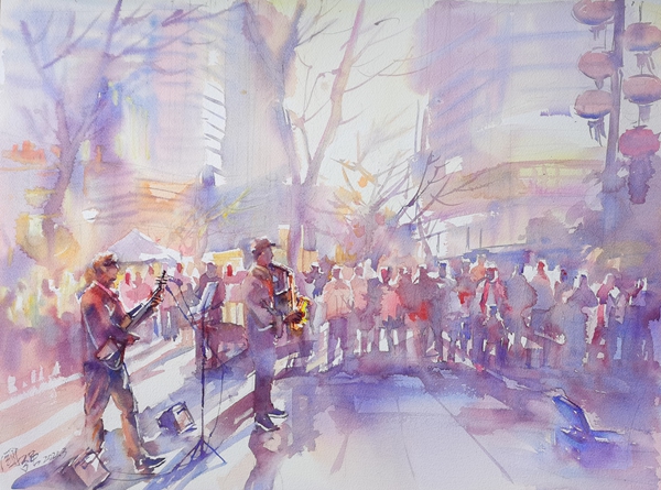 多年來城市景觀、城市生活都是我重點關注的題材。無論國內或國外的歷史建筑或現代景觀,不僅留下了以往的記憶,也記錄了這座城市的變化,激起我寫生及創作的欲望,我的目光始終關注城市中每個角落各式人物的活動狀態,我試圖用自已的圖式去記錄一個個平民百姓故往今來在城市日常生活的瞬間故事,反觀近年來我這些作品,只是探索路上一小步,還有很長的一段路…