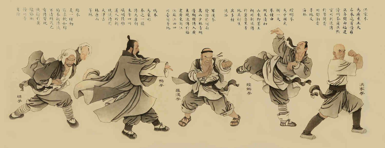 然而畫一百種拳談何容易,從哪里找資料呢?他先收錄熟知的二十余種,后來到舊書市場淘寶,加起來就有三四十種,再到圖書館查找。隨著漸漸深入,他了解到中華武術有上千種,不能樣樣都畫,必須找到重要的拳術,還要通過權威機構審定,否則太多了。于是,他從中國武協提供的拳種名單中對照、歸類。后來不僅從舊書中淘,還從 “碟片”中找。有一天他忽然開竅,播放碟片可以暫停,畫速寫作素材,“關鍵是要懂得在什么位置停格,看懂才能畫”。