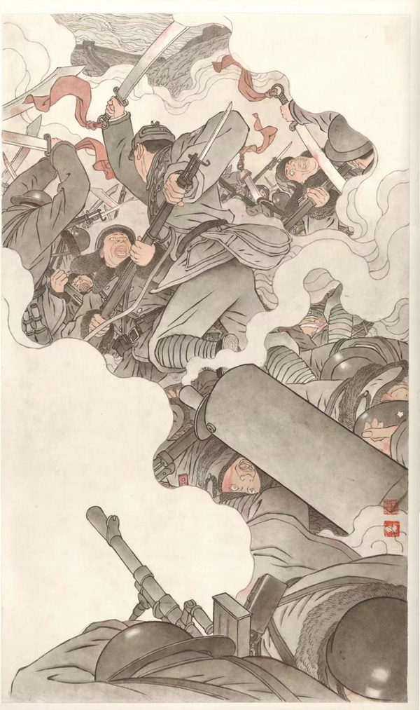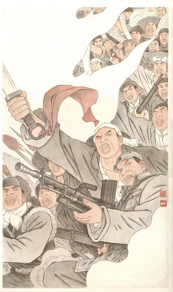 第一次讀到劉為民的作品,是在2015年上海圖書館舉辦的“紀念抗戰勝利70周年美術作品展”上。一幅長3.6米高0.9米的《喜峰口大捷》,描繪了抗戰時期“二十九軍大刀隊”在喜峰口與日寇搏殺的慘烈場面,人物眾多,完全把我帶入那沖鋒陷陣的硝煙之中,極富張力。我想那復雜對抗的動態描繪,如果沒有部隊生活體驗和扎實的造型能力,是不可能完成的,讀后一直在我的腦海揮之不去。于是,有一天我向海派連環畫、中國畫大家汪老(汪觀清)打聽《喜峰口大捷》的作者。汪老說:“這是一個喜歡武術,練武術又畫武術的畫家,畫得很內行,表現的武術動作功架看上去很真實。”