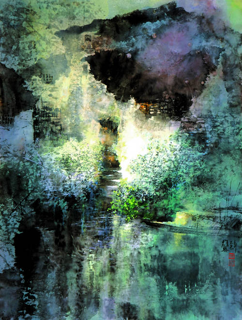 張復興近十年來踏山涉水,歷游山川,探索繪畫的新理念、新技法和新境界,尋求表現中國畫的當代語匯和個性特質,以直抒心性的方式和自由開放的情懷,力圖破解多畫種的界線,將不同繪畫元素與傳統筆墨相融合,構造出一種極具原創的技術,從而形成了全新中國畫山水的表達形式。