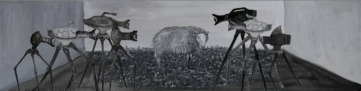 邱黯雄在中心三樓建立了一個浸入式的放映廳,其水墨動畫三部曲《新山海經》首次同場出現。從2006年創作《新山海經》開始,在過去的12年里該系列動畫已發展成一部深刻的移動影像志,利用先秦志怪古籍《山海經》中的神話元素與敘事結構,結合當代巨型城市景觀,投射對于現代性在中國及其困境的思考,而顯示出難以描述的科幻意味。《新山海經》涉獵的古典領域包括生物/動植物、地理、宗教、醫學等,邱黯雄描繪的獨特廢墟意象不僅傳達了文明更迭的夸張事實,同時與人工智能等科技成分協調,捏造了一系列描繪人類社會遭遇危機的奇觀。