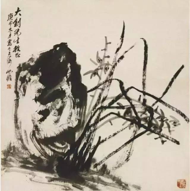朱屺瞻畫蘭,線條樸拙老辣,尤其是濃墨干筆擦出的飛白線條,蒼蒼茫茫,耐人尋味。