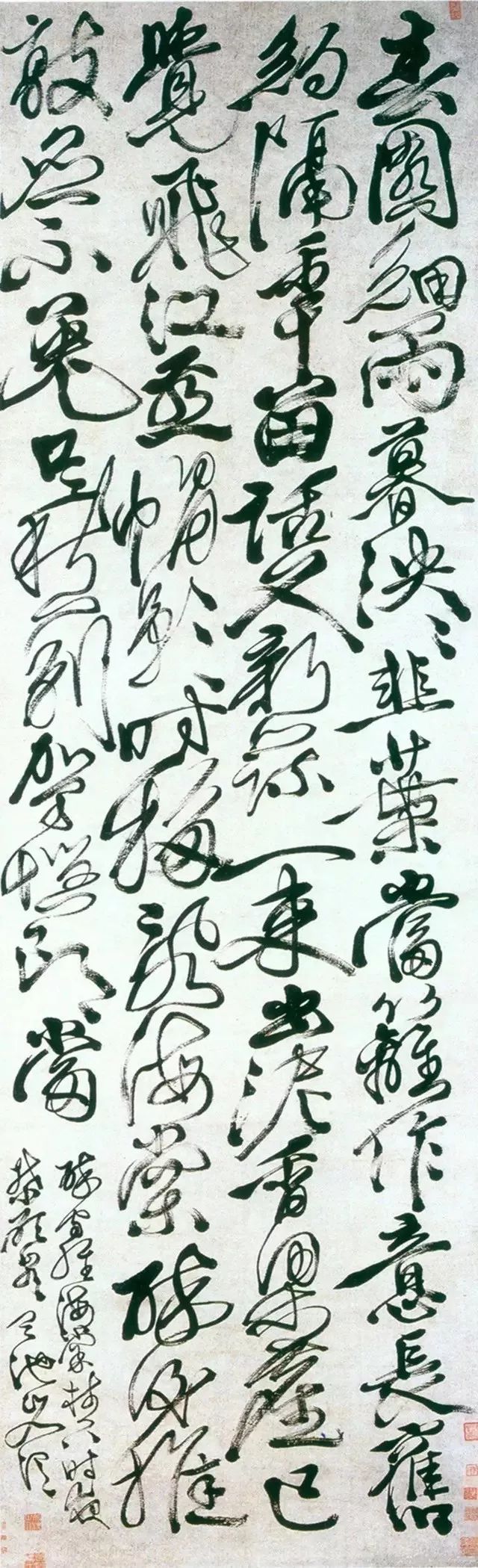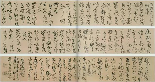 狂草最重視“氣”,歸結到一點,就是氣韻生動,貫穿于整幅作品中,是作者氣質和性情的外化??癫葜械木€條、布白、章法和結字等完全脫離固定的程式化模式,完全按照書家情感節律隨心而生,絕無既定的格式和不變的成法,即便是書家本人也無法再現。