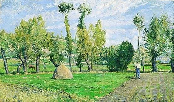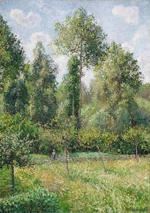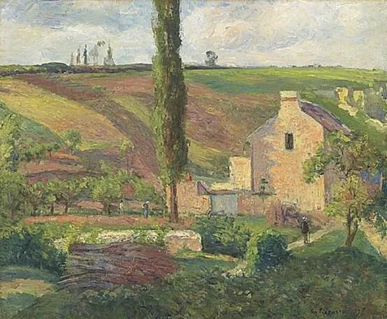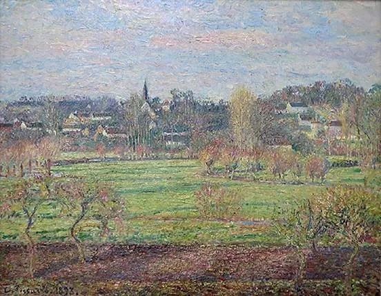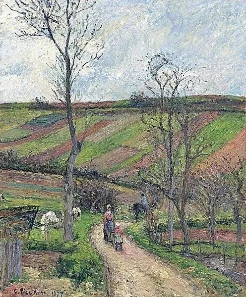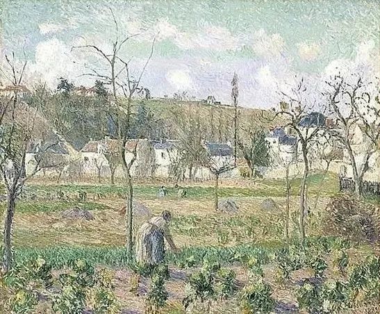 樹木的垂直效果,與田野的低矮,二者之間的對比關系,形成簡單的結構,把畢莎羅與其他印象派畫家的繪畫區別開來,使畢莎羅的繪畫具有一種寧靜、沉思感,而不再有"印象派"的緊張氣氛。