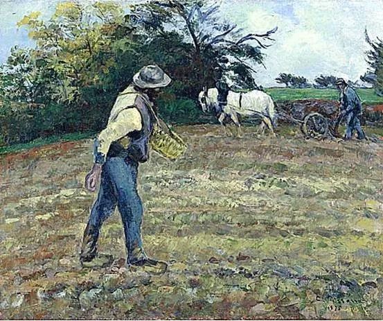 有人曾向竇加問起米勒和畢莎羅,他回答:“米勒嘛?是的,他的《播種者》確實是在為人類播種;而畢莎羅筆下的農民都是為了給自己掙面包而勤于勞動?!?畢莎羅對形態與技法進行了仔細的研究,成功地取得了他那充滿恬靜氣息的畫面。