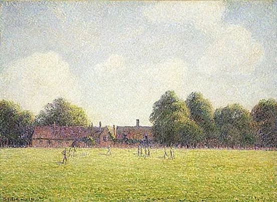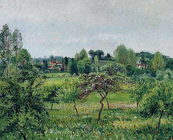 在這幅畫中,畢莎羅恰如其分地確定好形態,只用了少數幾種色彩,而那些濃郁的色調卻能顯現出水晶般清澈的畫面來,而且還呈現出天空里無盡的深淺層次,重疊交錯又分外清晰。