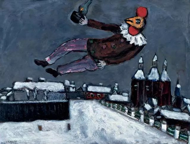 夏加爾的家庭是一個再普通不過的底層家庭,父親是鯡魚搬運工,每天把鯡魚的氣味和糖果一起帶回家。在夏加爾的眼里,父親是一只同時點亮和熄滅的蠟燭。敏感而內向的夏加爾帶著一種漫游的神態過著自己的內心生活,他喜歡坐在屋頂俯視這座城鎮。坐在屋頂,離近處更近,離遠處更遠,銀色的星星闖入天空。他坐在高處,驚喜地看著大火在全城蔓延,直到火花濺落他家的屋頂。雖然生活在底層,他的內心卻帶著一種超越生活的上升感,并為自己的敏感、孤獨和幻想感到模糊的優越。這個孤獨的孩子,當他穿行在維捷布斯克的人群當中,穿行在無數的姨媽和舅父之間時,并不知道自己的未來到底是什么,卻清楚地意識到,自己要過一種不同于他們的生活。