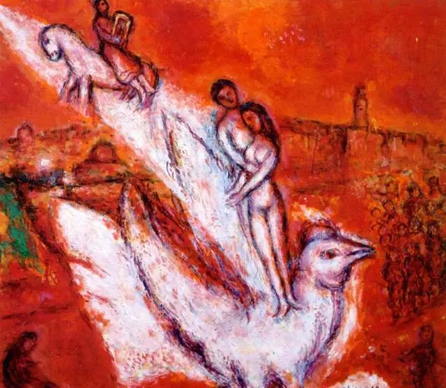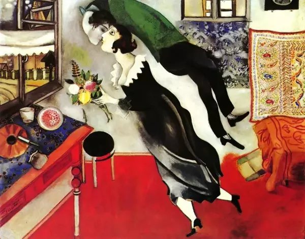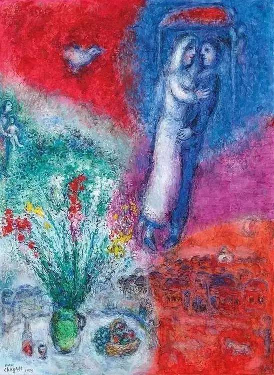 夏加爾尤其擅長浪漫的狂想。他在作品中談論最多的便是作為猶太人的生活之外的另一重大主題:愛情,特別是他對貝拉的愛情,他們于1915年結婚。貝拉死于1944年,6年后夏加爾創作了《紅色天空的戀人》:一對戀人一同飛過天空,正如夏加爾和貝拉在許多其他油畫中一樣。那些飛翔在空中的一對對戀人是夏加爾對西方繪畫界所做出的最可愛的貢獻,是基督教中那些偉大的漂浮意象、耶穌升天和圣母升天的世俗版本。