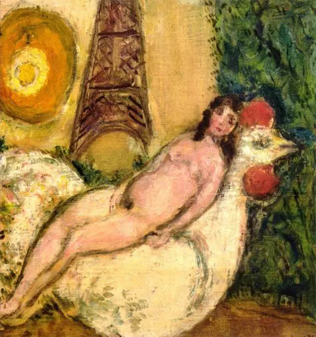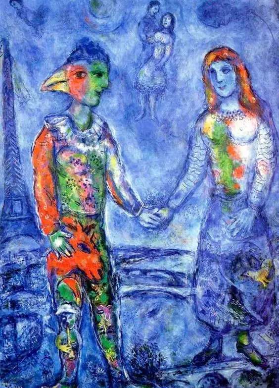 真正讓夏加爾激動的是印象派后期畫家對調色的運用,正如高更或梵高在使用顏色時極富表現力和激情,他們并不在乎綠色的臉龐在現實生活中是否也是綠色。這一點改變了夏加爾的創作觀念。在其作品中出現了整幅作品呈現鮮紅色、深綠色或紫色的情況。他的腦海中有一個發現:“我描繪的事物是我從俄羅斯帶來的。他們身上沾染了巴黎的氣息。”
