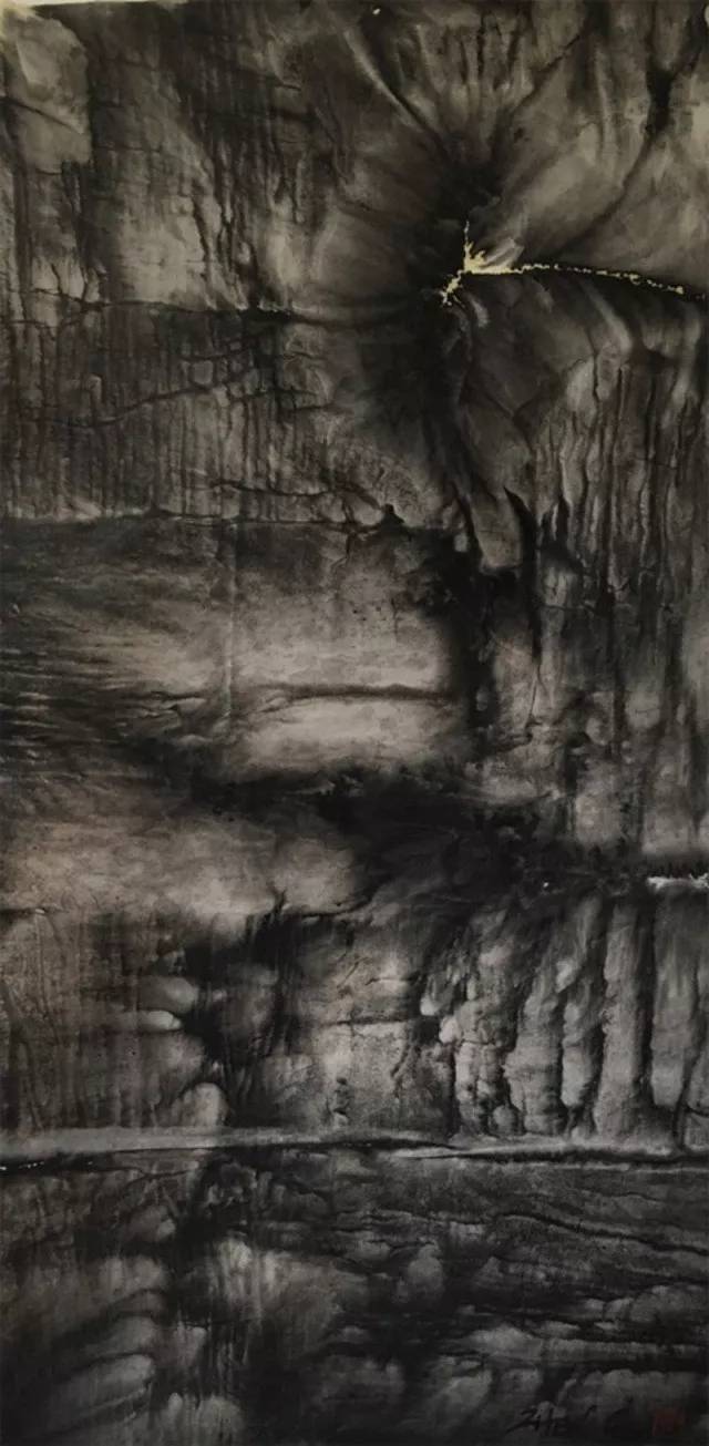 郭禎是來自美國的女藝術家,居住紐約幾十年了。她早年畢業于中國美術學院國畫系,八十年代國美是水墨實驗藝術的先鋒場地,郭禎和其他藝術家一起,都投入了這場風潮,之后“八五新潮”過去,移居西方,她骨子里的水墨情結卻未消失,而在一個大的中西方文化背景的比較下,她更意識到了作為一個中國人的文化選擇和本能表達,于是抽象水墨便成了她的選擇。在她的作品中,隨意暈染開來的墨跡,如同深淺不一的情緒,四泄而開,如同內心的隱秘地圖,千溝萬壑,起伏連綿,只有自己能走到。水和墨在交融那一刻產生的變化,充滿偶然性,這也是她尋求的效果。當觀眾在一種對水墨畫的慣性期待下突然看到這種沒有具體內容的畫面,思維模式受到了挫折,“看山不是山”,正是她追尋的哲學境界。