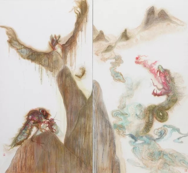王艾茵畢業于中央美術學院國畫系,來云南工作已經十多年了,在她的作品中,精靈古怪的各種生物像夢魘一樣纏繞著人,它們有或明或暗的出處,有些來自古傳說《山海經》,有些來自歷代神話故事,有些純粹出于她自己的想象。這個日常中溫言細語的女子,用自己的畫筆創造了一個迴異于其它的瘋狂世界,在這個世界中,這些奇詭的生物無一不帶著殘酷的表情和鮮艷刺目的色彩,它們莫名其妙的存在也是她內心情緒的一種宣泄。而傳統花鳥畫的技法和表現內容也在她這兒有了新的闡釋。