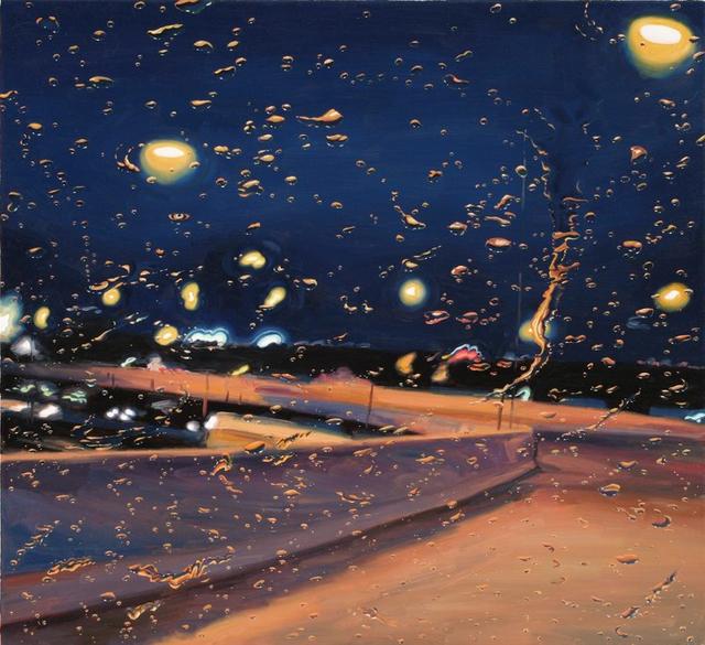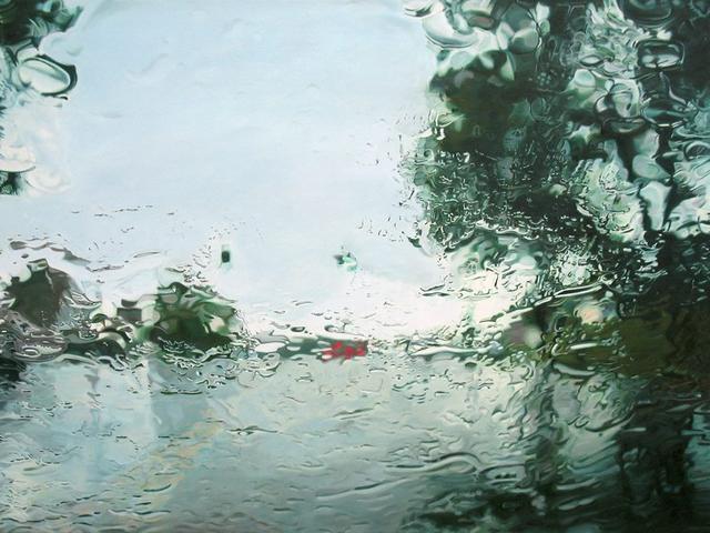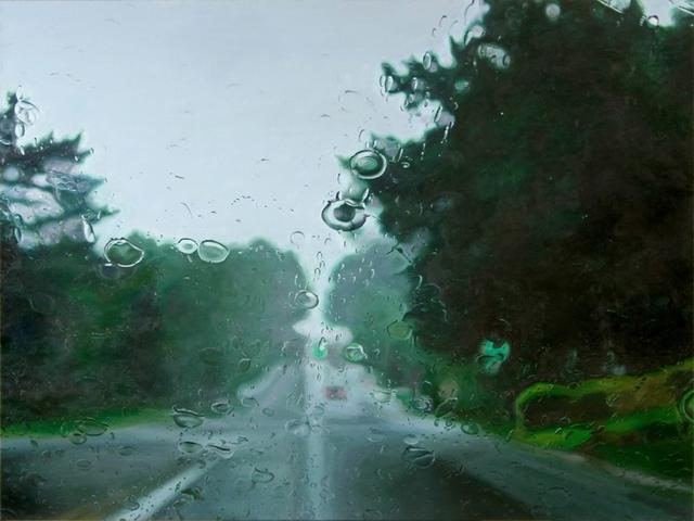 當代畫家Gregory Thielker的超級寫實主義油畫Under the Unminding Sky 《天空之下,漫無經心》,描繪了一系列車窗雨景。開著車,關閉刮雨器,穿越無數場暴雨,咔嚓咔嚓按下照相機快門。這些油畫就是他根據他所拍下的照片而畫的。
