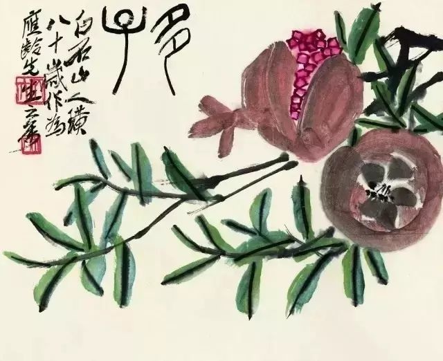 中國(guó)人視石榴為吉祥物,作為家族興旺、多子多福的象征。北京畫(huà)院藏有一幅齊白石1922年作的《石榴》,這已是他在北京定居的第三個(gè)年頭。對(duì)家鄉(xiāng)的思念,對(duì)親人的眷戀,時(shí)刻縈繞他腦中,對(duì)那些曾經(jīng)維持自己和家人生計(jì)的蔬果,他依然難忘——“充肚者勝半年糧,得志者勿忘其香”、“飽諳塵世味,尤覺(jué)菜根香?!?