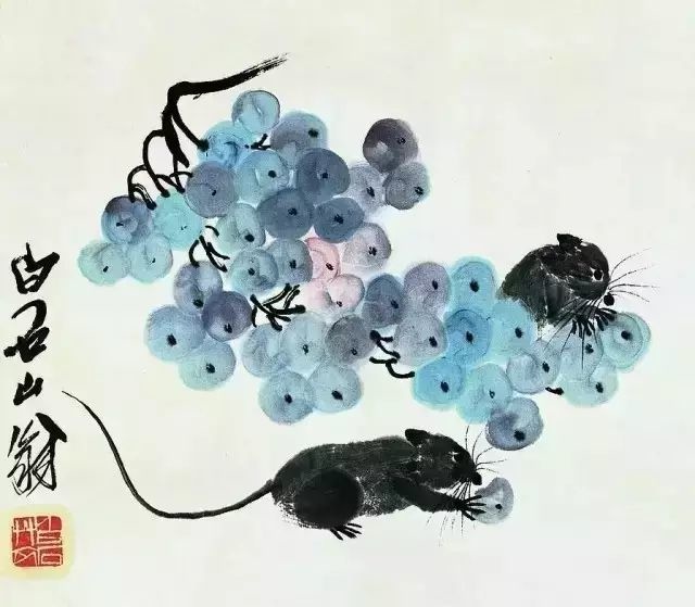 白石老人常畫(huà)葡萄,葡萄籽多,因而寓意“多子多?!薄L贄l、墨葉之間,晶瑩剔透,猶如一串串紫色的明珠,呈現(xiàn)出旺盛的生機(jī),也營(yíng)造了畫(huà)面明朗樂(lè)觀的基調(diào)。