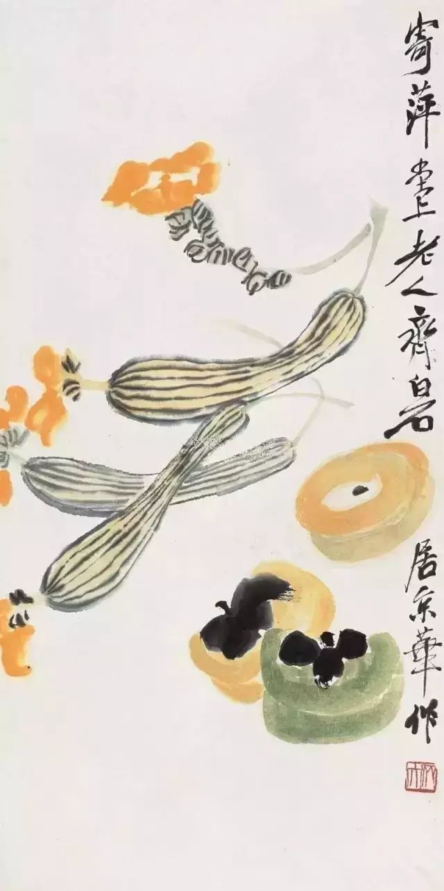 在齊白石眾多的繪畫(huà)題材中,蔬果類作品是最能觸及老人思鄉(xiāng)情結(jié)的一類,他將這些日常所見(jiàn)之物,寄予了深層精神內(nèi)涵,超越了繪畫(huà)的內(nèi)容和形式。齊白石最愛(ài)畫(huà)的各種蔬菜,都是他從小就吃過(guò)、種過(guò)的東西,牽系著他的兒時(shí)記憶與鄉(xiāng)思。順便一提,這不是小長(zhǎng)假結(jié)束了嘛,知道你們不開(kāi)心,這不是讓你們賞心悅目來(lái)了嗎?