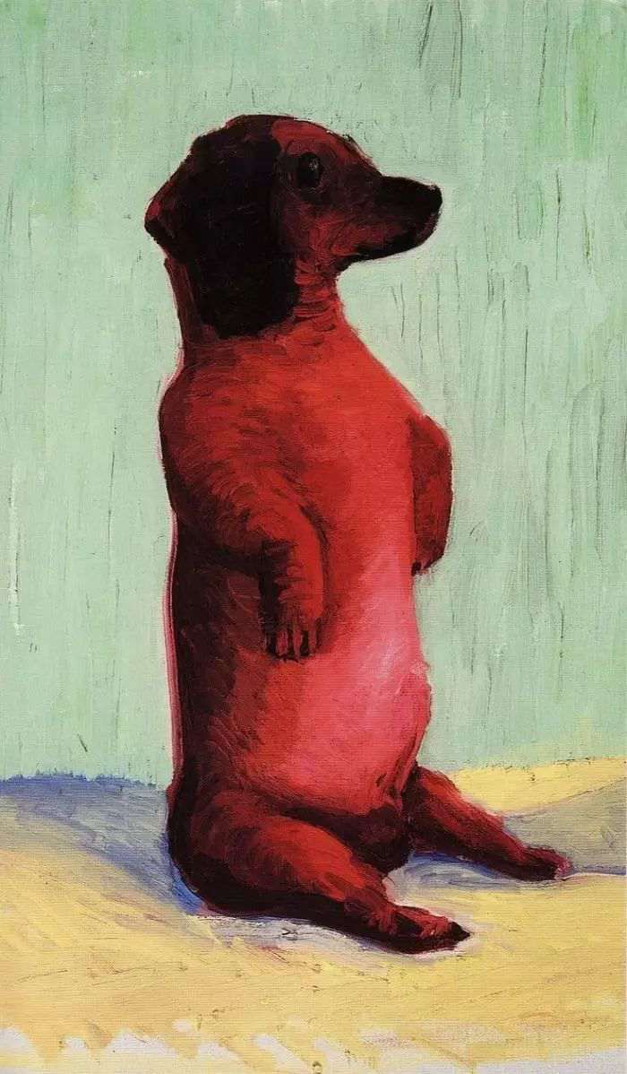 霍克尼這樣記述自己繪制小狗的經(jīng)歷,“從1993年9月起,我開始畫我的狗。這需要大量的準(zhǔn)備和計(jì)劃,因?yàn)楣穬簜兺ǔ?duì)藝術(shù)不怎么感興趣(我說‘通?!且?yàn)槲椰F(xiàn)在遇到過了一只會(huì)唱歌的狗)。食物和愛統(tǒng)治了它們的生活?!?