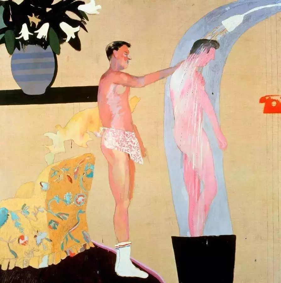1961年,還在讀書的霍克尼創(chuàng)作了《我們兩個(gè)男孩緊緊膠著》,表現(xiàn)同性愛情。在同性戀并未合法的英國(guó)社會(huì),他的態(tài)度招來不少爭(zhēng)議。他偏愛畫和自己關(guān)系親密的人,創(chuàng)作了大量裸體肖像和同性愛的作品。比如“泳池與水花飛濺”系列,畫中模特男友Peter Schlesinger的肉體總是顯得很快活。當(dāng)別人問他:“你是否認(rèn)為你的藝術(shù)改變了人們對(duì)同性戀的看法?如果是,這對(duì)你有多重要?”霍克尼回答:“也許有,我認(rèn)為這是一件好事。”他完全誠(chéng)實(shí)并足夠自由,同性戀并沒困擾他。他總是說,我們生活在波西米亞,而那里是寬容的。