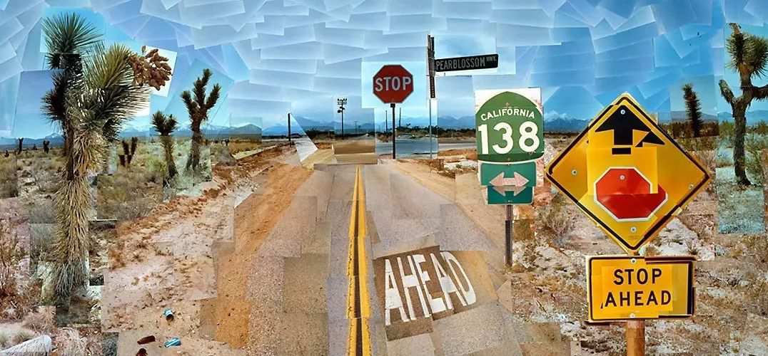 在拼貼創(chuàng)作過程中,霍克尼以“透視需要被扭轉(zhuǎn)”來挑戰(zhàn)西方繪畫的傳統(tǒng)透視方法——焦點(diǎn)透視,同時(shí)拼貼也幫助他更深入地了解立體主義——當(dāng)然,立體主義也是一種透視的技術(shù)。1986年4月11日至18日,霍克尼創(chuàng)作了他最具代表性的拼貼作品《梨花公路》,這件作品也被他看作當(dāng)時(shí)攝影創(chuàng)作階段的結(jié)束,通過打破單一焦點(diǎn)和視角,霍克尼實(shí)現(xiàn)了一種“更大的圖像”式的觀看之道。