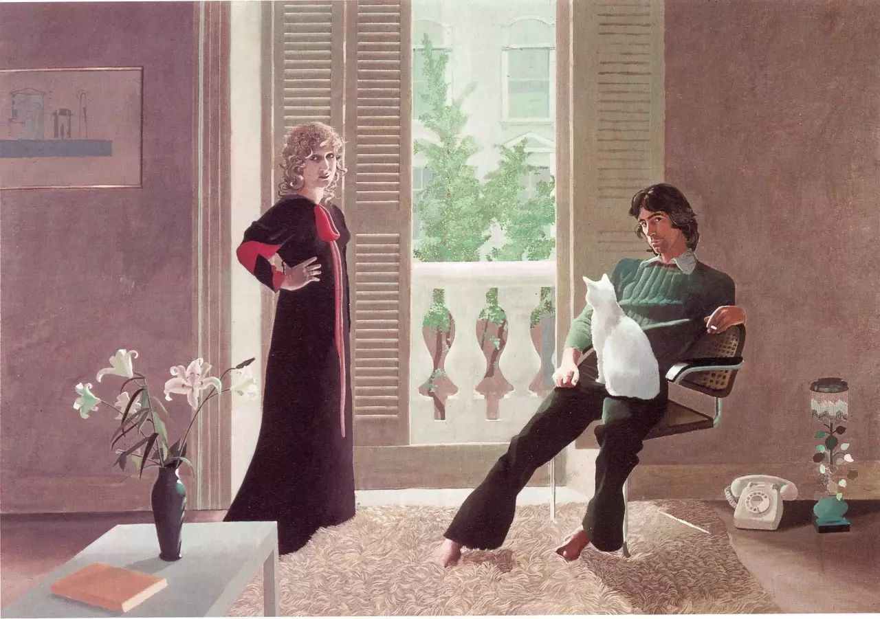 這段時(shí)間(20世紀(jì)60年代至70年代),霍克尼開始創(chuàng)作典型的霍克尼式風(fēng)景畫:畫面構(gòu)圖簡(jiǎn)潔,呈現(xiàn)出典型的對(duì)稱性,人物關(guān)系中盡藏微妙。因?yàn)檫@種“最時(shí)髦的意識(shí)”和“優(yōu)美機(jī)智”的創(chuàng)作,他獲得了“具象繪畫的莫扎特”的稱號(hào)。