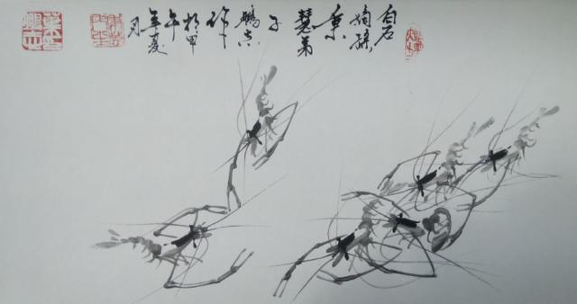 山水構圖奇異不落舊俗,篆刻獨出新意,書法卓然不群,可謂全才,所以齊白石被人們稱為近代杰出的藝術大師。他的蝦神態各異,游資舒暢自由,活潑生動、動態生息。兩橫濃墨便成眼睛,夸張得體,腦袋中間用重墨做蝦頭,左右二筆淡墨使蝦的頭部變化多端。軀殼的透明和蝦的重量被這由深到淺墨色表現了出來。而蝦的腰部,一筆一節,連續數筆,形成了蝦腰節奏的由粗漸細。微妙的用筆變化,使蝦的腰部呈現各種異態,有躬腰向前的,有直腰游蕩的。也有彎腰爬行的。蝦的尾部也是寥寥幾筆,既有彈力,又有透明感。蝦的一對前爪,由細而粗,數節之間直到兩螯,形似鉗子,有開有合。蝦的觸須用數條淡墨線畫出。長須布置得當,其線條似柔實剛,似斷實連,直中有曲,亂中有序,圖中之蝦似在水中嬉戲游動,觸須也似隨蝦身晃動。此圖充分表明白石的用墨用水功夫之精妙,他所表現出的蝦體似乎總是水淋淋的,如同真的生活在水中,白白的宣紙便成了清澈的溪水。這大概就是白石筆下的蝦為什么永遠富有生命力的原因所在。