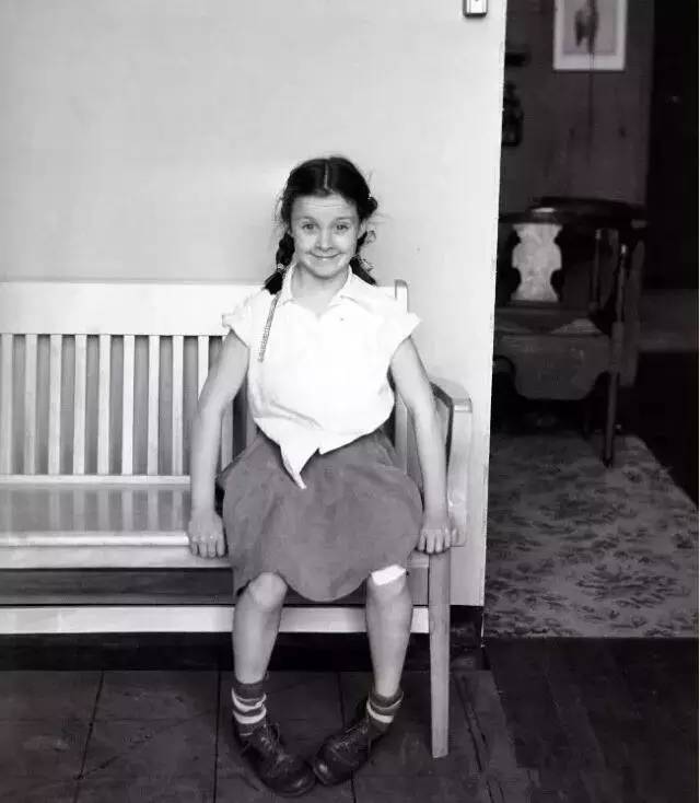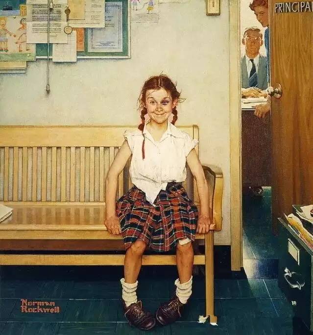 這個小女孩比原來多了一個青腫的眼窩,在畫面的后方又多了一對似乎正在議論著她的男士,而女孩的和做著的男士的眼神又好像望著畫面中看不到的第四個人。