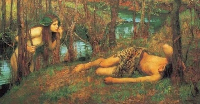 水之仙女剛剛上岸,她從樹干的縫隙中窺看裹著豹皮的熟睡的青年。畫面中幾乎無處不在的紅色和綠色的對比(俗稱紅配綠)被湖水反射出的藍色減弱,并呈現出相當的協調。