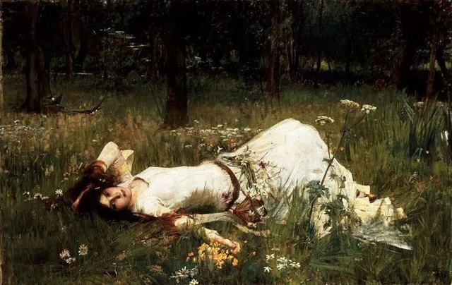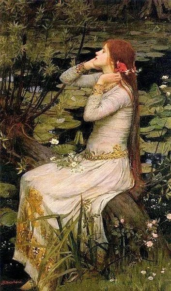 奧菲莉亞是莎士比亞創作的著名悲劇《哈姆雷特》中的一個人物,她躺在河岸草場上,眼神瘋狂而絕望,一只手握著亂發,另一只手抓著一束花。