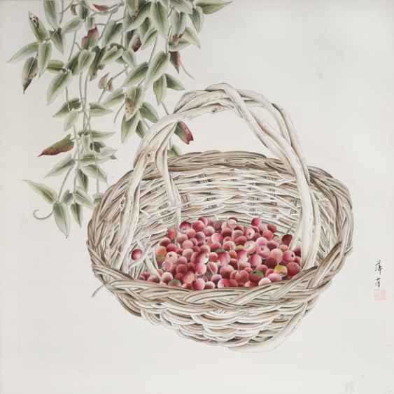 菊萍芳《葉綠桃紅》國(guó)畫(huà) 65×65cm