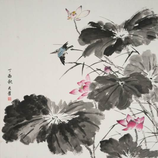 張慈鐘《荷花小鳥(niǎo)圖》國(guó)畫(huà) 68×68cm