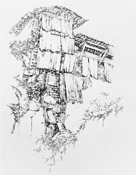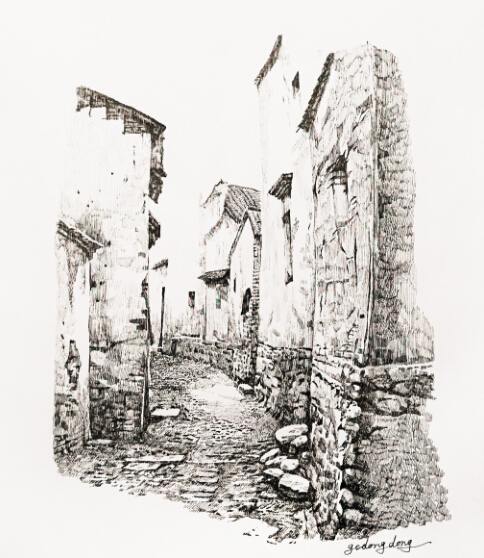 黃根裕《古鎮(zhèn)圖》鋼筆畫(huà) 39×54cm
