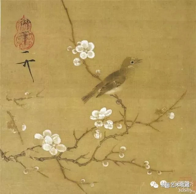 圖中梅枝瘦勁,枝上疏花秀蕊,一只繡眼俏立枝頭,鳴叫顧盼,與清麗的梅花相映成趣。此圖雖景物不多,卻頗優美動人。所繪梅花為宮梅,此種梅的畫法精細纖巧,敷色厚重,自有一種富貴氣息,這樣的風格趣味為宮廷所好尚,顯然代表了皇家的審美意味。