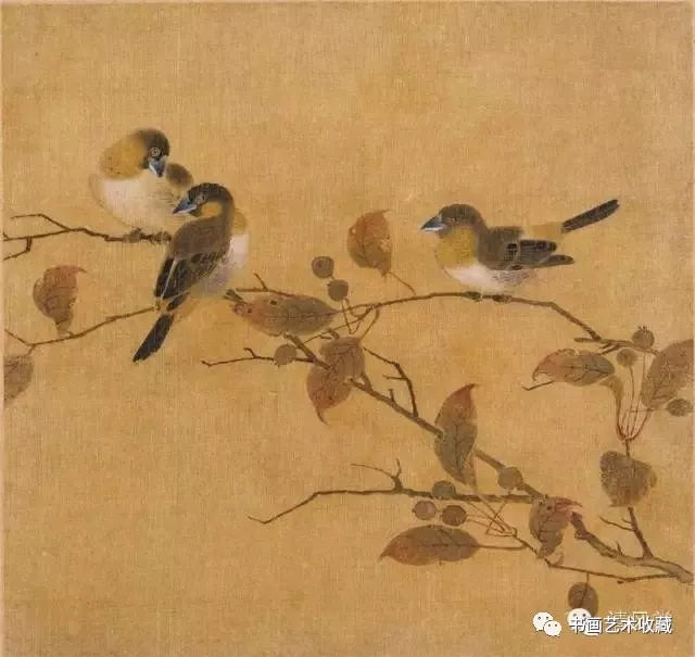 宋代是花鳥畫的成熟和鼎盛時期,在應物象形、意境營造、筆墨技巧等方面都臻于完美。此圖三只文鳥姿態各異,樹枝一筆畫出,用赭色構描葉脈與細枝。樹葉、小果采用沒骨畫法。文鳥以中鋒細筆絲出羽毛,用白粉、赭石、濃淡墨輕染,真實細膩,高度寫實。構圖疏朗,動靜結合。