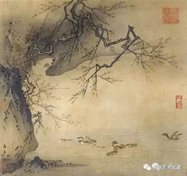 峭壁之上,兩株梅樹一上一下,紅白相映,錯落而開。紅梅枝干虬曲,取蒼龍探海之勢,這是馬遠畫樹的典型畫法,人稱“拖枝馬遠”。下方的野鴨既起到了平衡畫面的作用,又是全圖的點睛之筆,一幅“春江水暖鴨先知”的景象,無限生趣,躍然絹素。臺北故宮博物院藏。