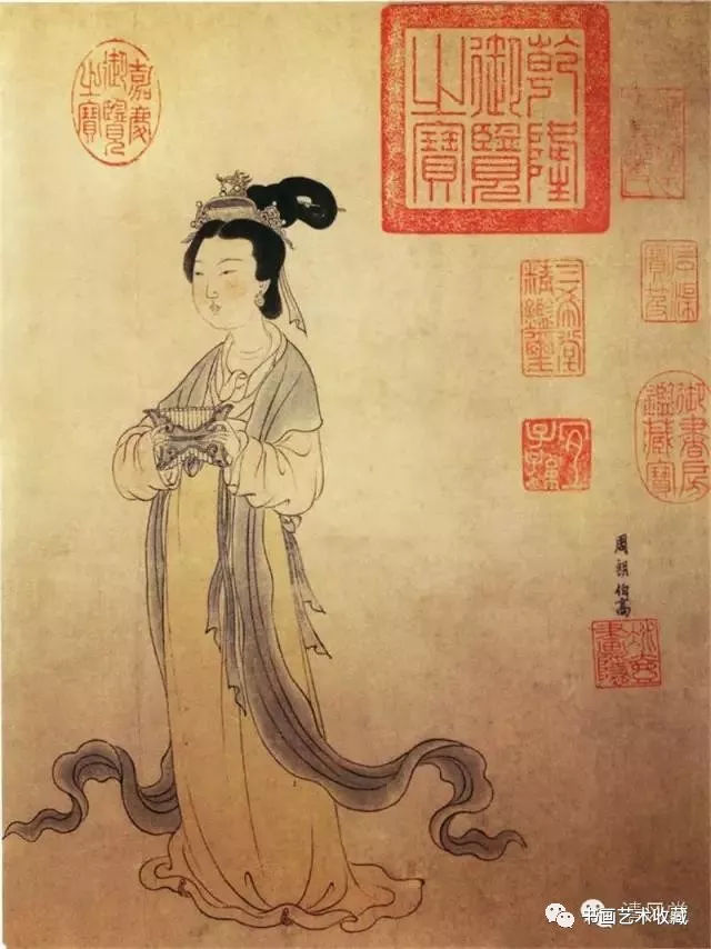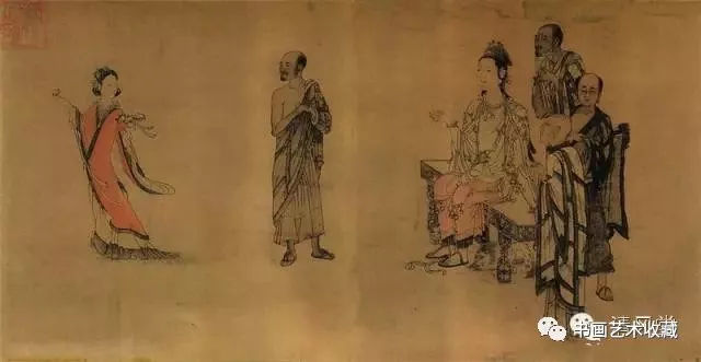 此圖中天女手捧花藍,邊舞邊散,對面菩薩神情安逸,微笑觀看,周圍幾位羅漢則已被天女的舞姿所吸引,面露欣賞之色。劉松年,“南宋四大家”之一,師承李唐,畫風筆精墨妙,清麗嚴謹,設色典雅,界畫工致。所畫人物神態生動,衣褶清勁,精妙入微。