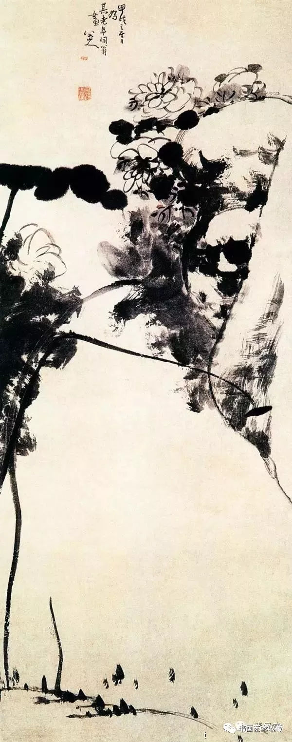 畫之左側伸出幾片荷葉,大筆重捺,或潑墨大寫,荷莖圓轉蒼勁,曲折舒張,荷花輕柔婉轉,與之相對寫一倒懸危石,只略加勾皴,石頂一叢芙蓉,墨韻盎然。荷石在上相接,下方留白,中似無物卻有空瀠幽遠之意。整幅畫墨氣縱橫,用筆似游龍盤旋,充分體現了八大山人的繪畫特點。