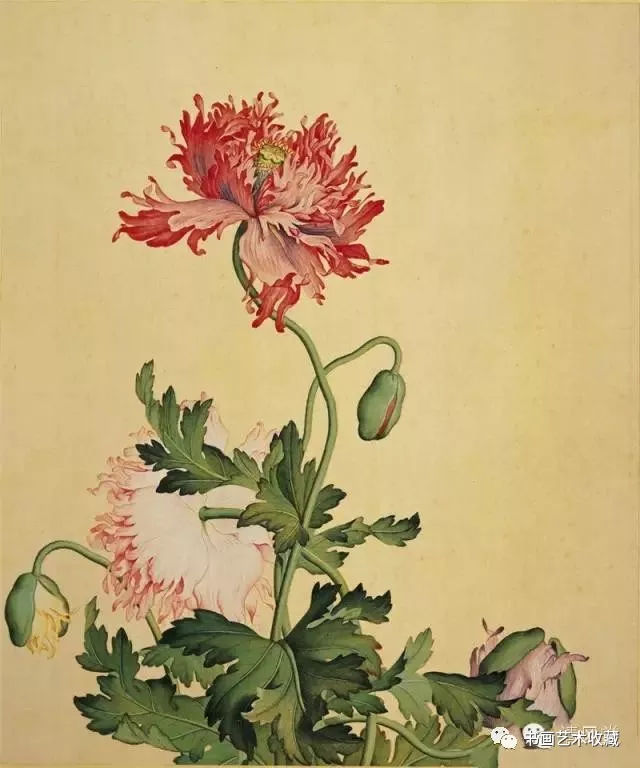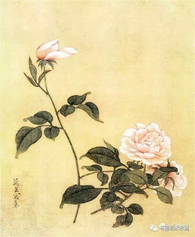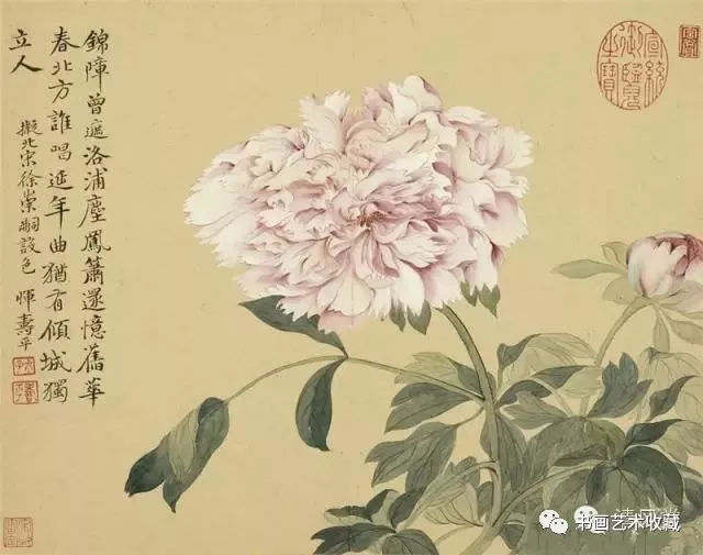 此幅寫折枝牡丹,一支盛開艷放,一支初吐芳華,清姿艷態,嬌美動人?;ǘ湟缘疵?,以丹、鉛二色暈染,寫實生動。輔以深淺綠葉,以濃墨勾筋,線條圓潤飽滿,葉片清秀灑脫,疏密有致,為其花卉寫生佳品之作。