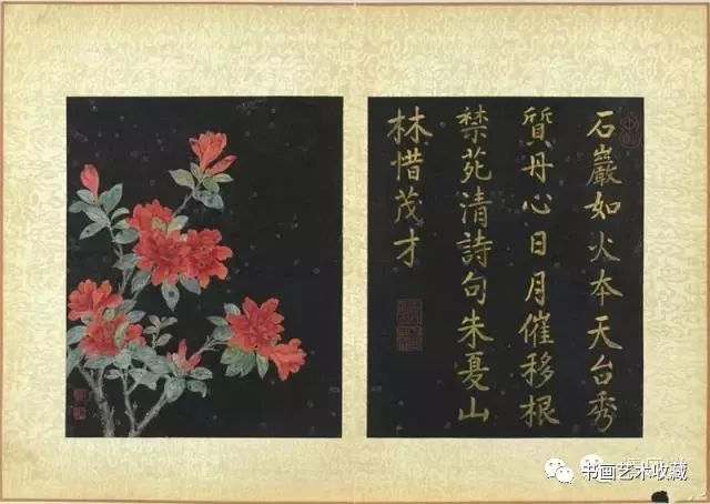 本幅黑底彩繪杜鵑花,紅綠交映,對幅金書,顯得富貴喜氣。雖然用色鮮艷飽和,但因襯以少見的深色背景,反而使畫面沉靜平穩,益發顯得花色照人眼明。花瓣筋絡與葉脈勾畫仔細,花朵從瓣緣至花心用色漸深以營造立體感,可見畫家對自然的入微觀察。臺北故宮藏。