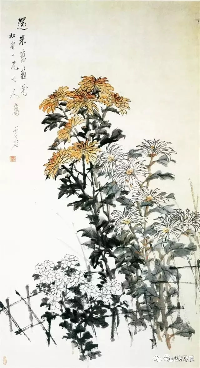 此畫中斜寫黃白菊花于矮籬前綻放爭秋。筆墨出神入化,側峰逆運,淡彩焦墨,筆筆送到。黃菊枝葉以水墨暈寫,而白菊卻以青葉相襯,桿加赭色。兩菊雖枝葉交雜,卻密而不亂,層次分明。干筆疾勁,勾出矮籬,白花矮叢使畫面穩定平衡。背景雖無它物,卻充滿空寥寂靜之意。