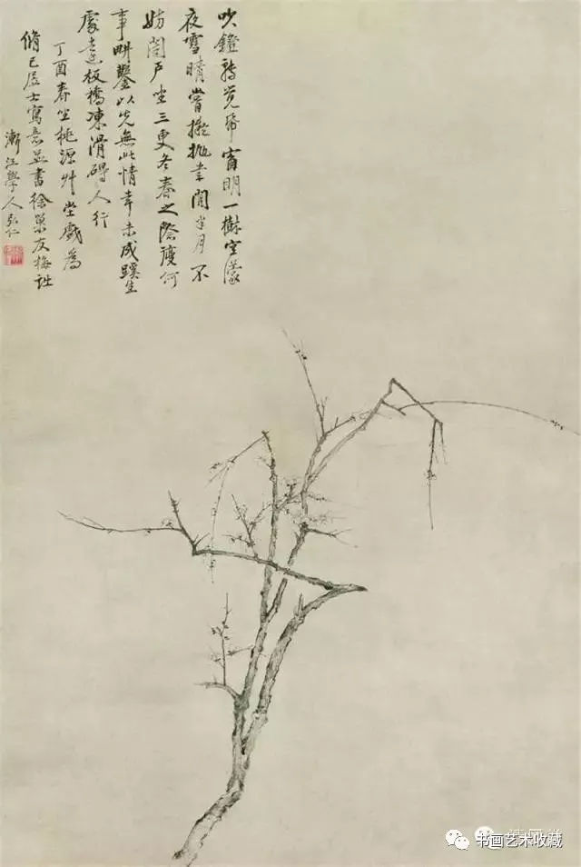 此幅墨梅圖雖簡率,但見功力,有代表性。為清順治十四年(丁酉),即1657年春做,時年48歲。此畫給人以清新的感受。弘仁最愛畫松樹、梅花。他曾自號“梅花古衲”,并遺命友人于其墓側多種梅。