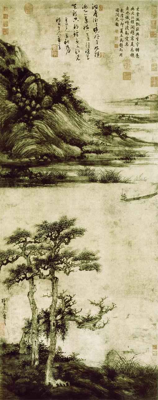 《洞庭漁隱圖》構圖類似倪瓚的“三段式”:下面坡岸以干筆畫三株樹,兩株松樹高大挺直,一株柏樹側其后,藤蔓纏身;中間是湖水,一小舟載漁夫蕩其中;上面是遠山的坡岸、汀渚。山上木葉茂盛,水邊水草葦葉叢生,向兩邊披拂,這在前人畫中似不多見。濃墨濕筆點葉,點苔,彰顯草木的旺盛,生機勃勃。坡上的礬頭,以及坡石的濕筆長披麻皴,顯示了他師法巨然的淵源,加上水草的弧曲,與樹干的挺直剛柔相濟,干濕對應。小舟置于畫面的右邊,略側,與水岸的橫平,形成小側角,而這對破除水線及樹干造成的橫平豎直的視覺極為有益。