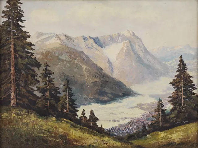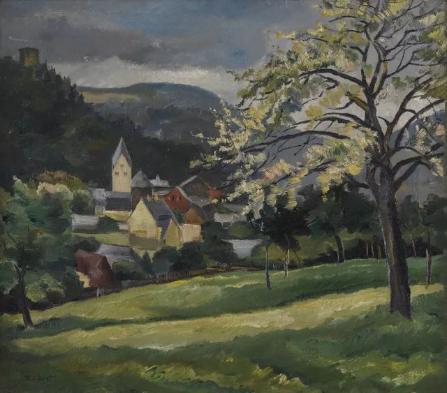 赫爾曼·施密茨·波恩(Hermann Schmitz-Bonn,1903-1960),曾就學(xué)于杜塞爾多夫?qū)W院師從馬克斯·克拉倫巴赫。1939-1957年擔(dān)任杜塞爾多夫“Malkasten”藝術(shù)家協(xié)會(huì)會(huì)員,活躍于杜塞爾多夫、埃菲爾等地。雖然同樣注重研究光線與空氣折射的表現(xiàn),與老師克拉倫巴赫不同,波恩著重于山景的描繪,作品中近景、遠(yuǎn)景交錯(cuò),交相輝映。